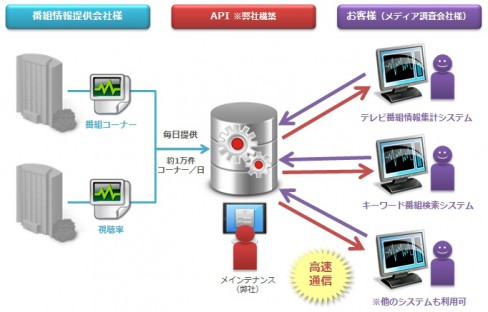 | 当社の取り組み | 弊社はコンサルティングから取り組ませていただきました。その結果、お客様は高速化以外にも、別のシステムでも活用できるような汎用性も希望されていることがわかりました。 そこで、テレビ番組情報集計システムのエンジン部分となるAPI(Application Program Interface)構築をご提案し、採用いただくことができました。